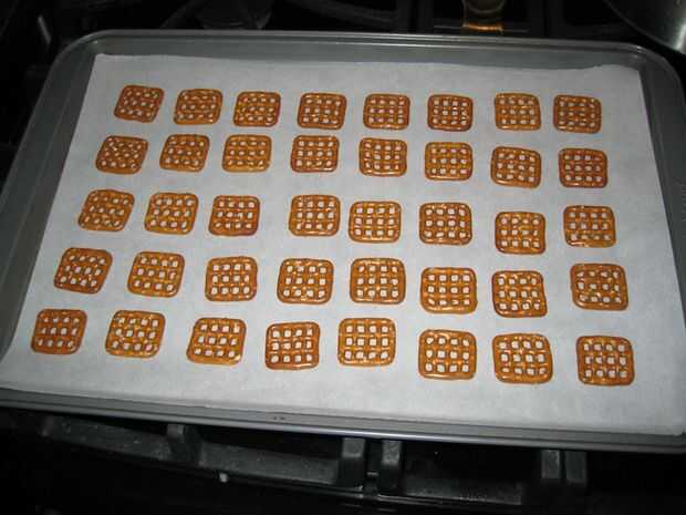 Una vez que haces eso simplemente coloque una capa o pretzels en una hoja de galleta cubierto de papel de pergamino dejando algo de espacio alrededor de cada uno.
