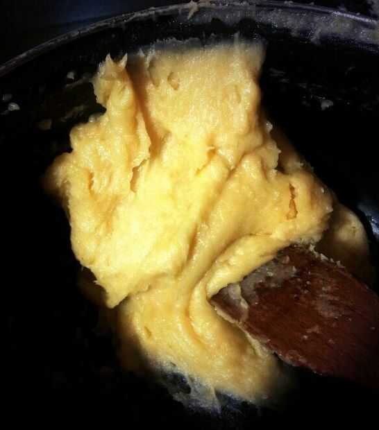Se capitana la masa del fuego y se deja pierda algo de calor, vamos par uno a uno los huevos, hasta la masa no ha absorbido completamente el primero no le añadimos el segundo.