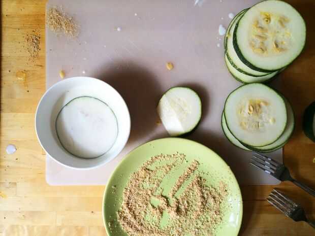 Rodaja de calabacín de inmersión en la leche de ambos lados. Sacuda suavemente el exceso. Poner en la mezcla de migas de pan y sacar algunos más para cubrir la parte superior.