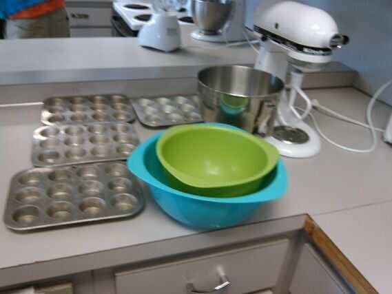 Dos recipientes de mezcla, tres latas de muffin engrasados y las manos.