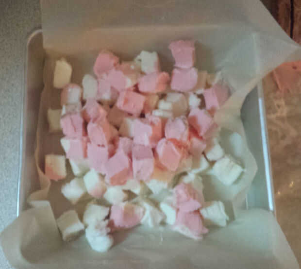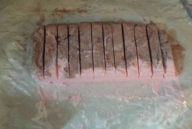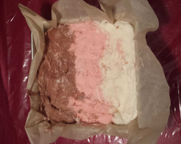 Retire el recipiente del congelador y remover el helado con el papel sulfurizado por debajo. Cortar el helado en cuadrados. Usted tiene para trabajo rápido el helado comenzará a fusión.