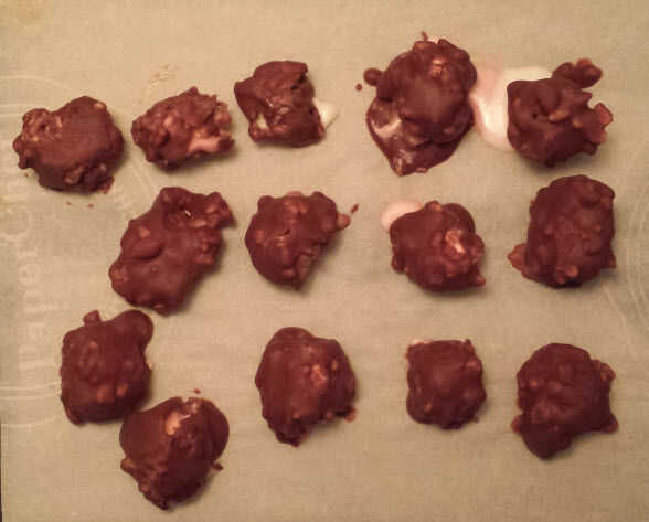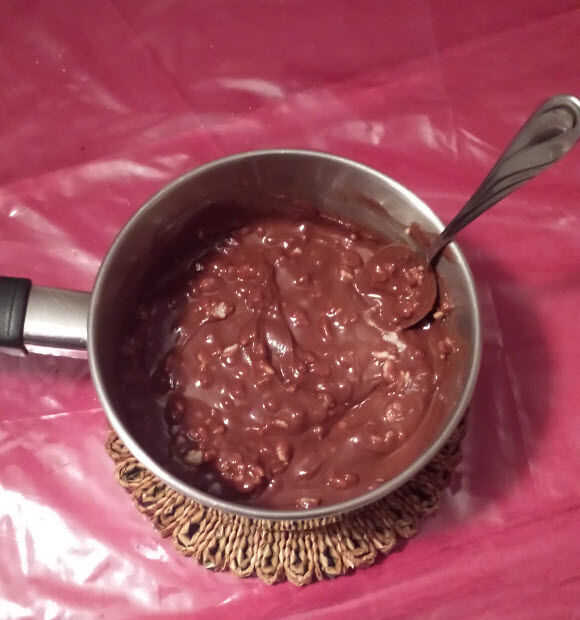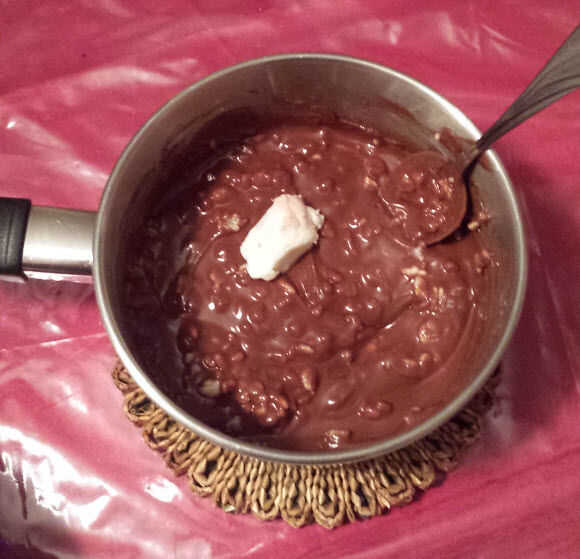 En una caldera doble, empezar por derretir la mantequilla y agrega el chocolate revolviendo constantemente. Cuando el chocolate se derrite y se vuelve suave, agregar un puñado de arroz Krispies, mezclar en el chocolate y quitar de la caldera.