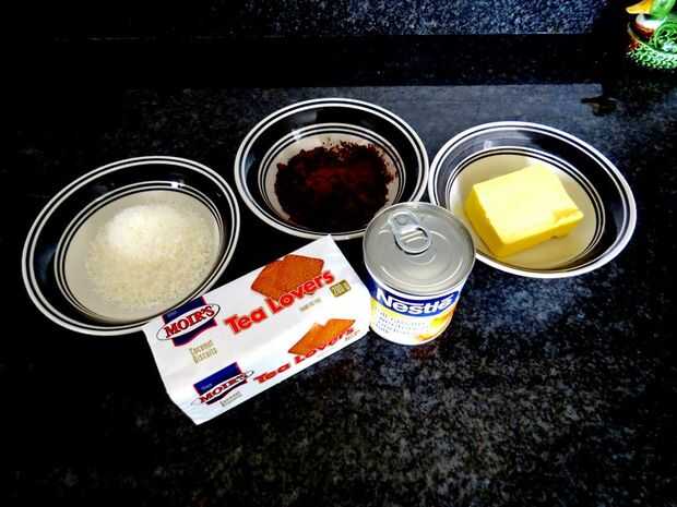 Estos son los ingredientes necesarios para hacer las bolas de chocolate: -1 paquete de galletas (su opción) -1 lata de leche condensada -100g de mantequilla -3 cucharadas de cacao en polvo -coco o chocolate picado (opcional)