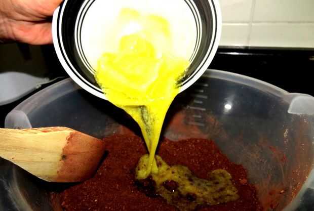 Derretir la mantequilla en el microondas durante 30 segundos y verter en la mezcla de galletas y cacao. Mezclar todo con una cuchara durante aproximadamente 1 minuto.