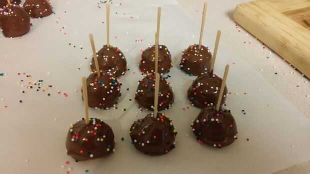 Aunque las manzanas cubiertas de chocolate siguen siendo ligeramente húmedas se puede decorar con granas o lo que desea.