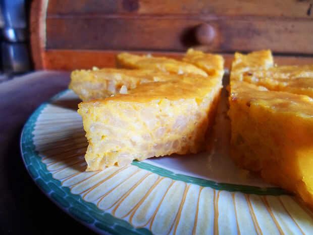 Es un pastel muy suave pero crujiente y su consistencia particular hace que el sabor aún mejor. El arroz y las almendras hacen muy crujiente, pero el resto es muy suave y sabrosa, muy similar a un flan.