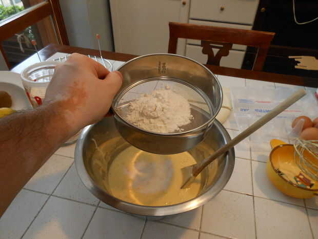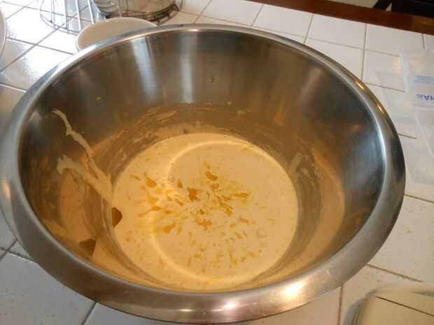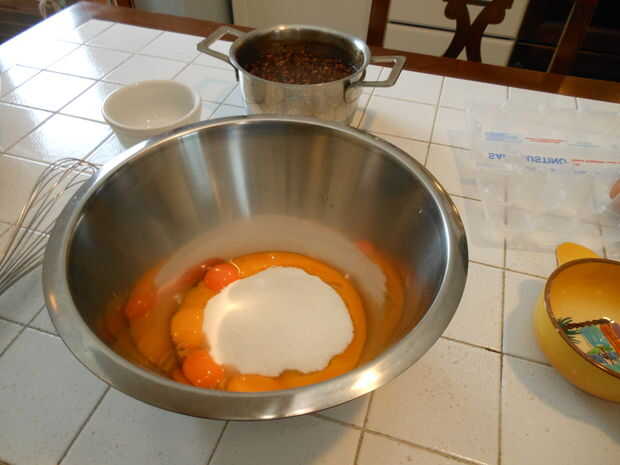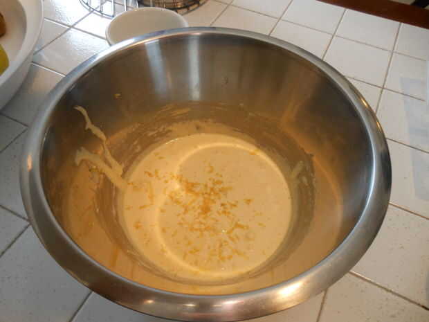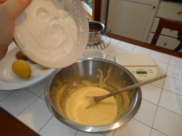 Batir las yemas con el azúcar, luego añadir el aceite y la ralladura de limón.