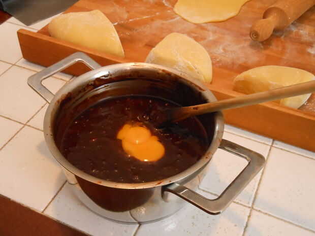 OK, Siel relleno wasready cuando comprueba, antes de youdo nada más extraer doughfrom la nevera. Luego agregar las yemas de huevo para el relleno y mezclar bien.
