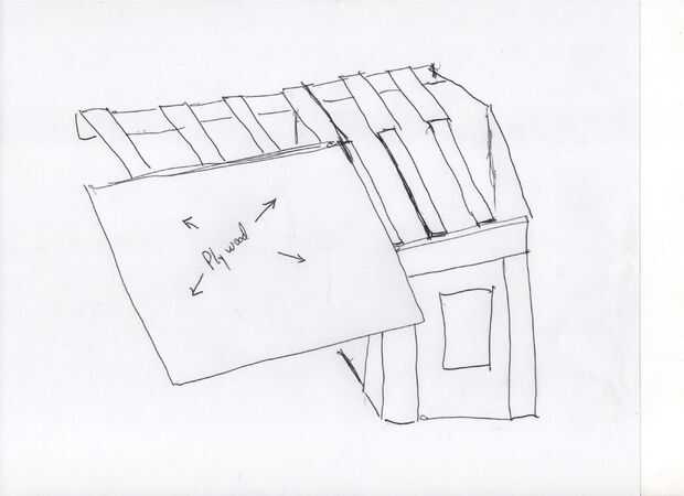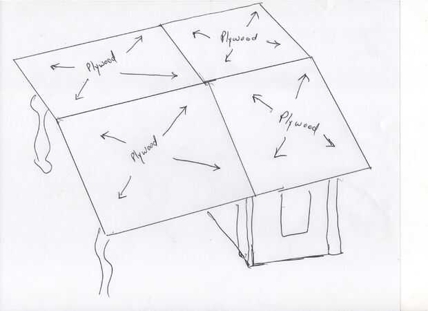 Bueno, siguiente paso es poner la madera encima de los 2 x 4. La madera contrachapada se extiende sobre el 2 x 4 y estará apoyada por el marco alrededor del borde. La caída excesiva más sobre la estructura de la cob, la mejor, para evitar que el agua de remojo la mazorca durante la temporada de lluvias. La mazorca puede manejar muy bien la humedad, pero durará más tiempo el más protegido está.