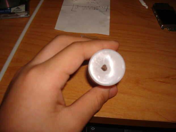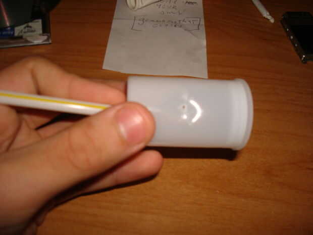 Primero tienes que perforar agujeros en la parte inferior de la lata de película y al lado ve fotos 1 y 2 (la parte inferior es el lado que no se desprenden también Asegúrese de que la paja se adapta perfectamente en el agujero inferior)