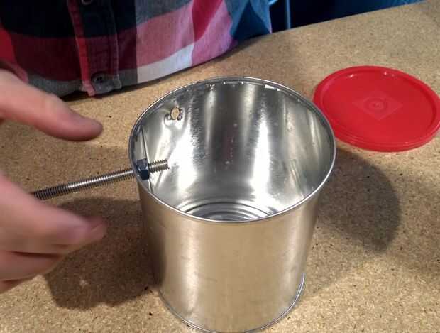 La varilla roscada de 5/16" va sobre los agujeros hicimos con el taladro. Dentro de la lata debe de quedar aproximadamente 1cm de varilla y la aseguraremos con una tuerca.
