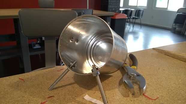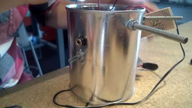 Ahora utilizamos el 3/8" pedacito de taladro para hacer los 2 agujeros que marcamos en el lado de la lata en lugar de Jack IN (para el reproductor de mp3) y para el potenciómetro / perilla de volumen.