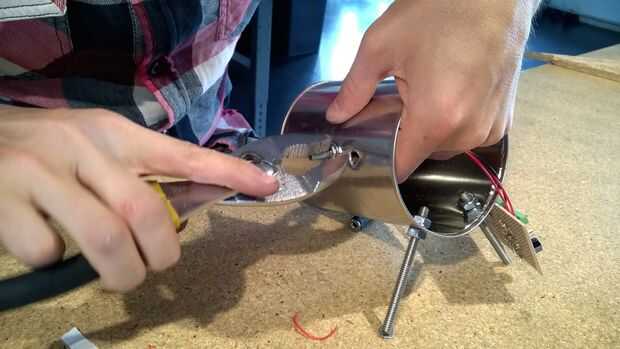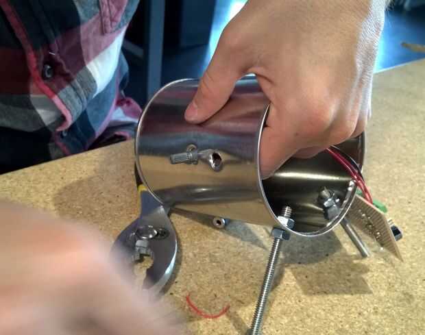 En la parte lateral de la lata volvemos a marcar dos puntos y barrenamos (para el interruptor y el conector de entrada). Aquí utilizaremos la broca de 3/8"