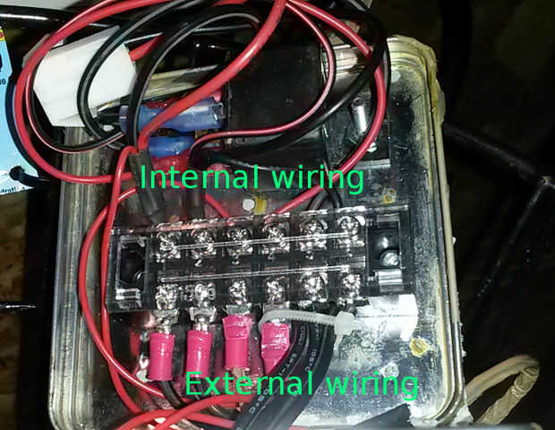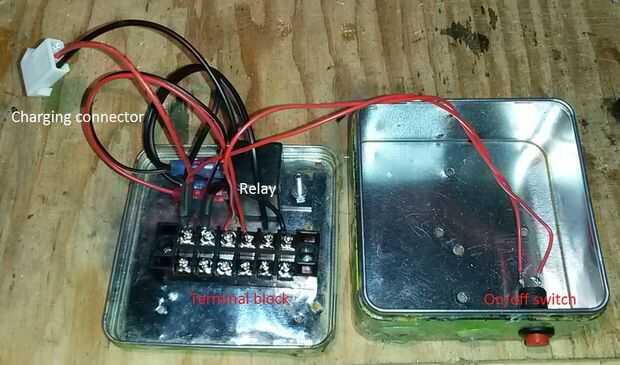 Siga el diagrama de cableado. El encendido/apagado interruptor, el relé y el bloque de terminales fueron Unidos a una caja. Se utilizaron conectores Crimp para conectar a los contactos de la batería y del relé. Amarres de cable pueden utilizarse para el alivio de la tensión los cables. Asegúrese de que cuando la caja se abre y cierra los hilos no doblan demasiado.