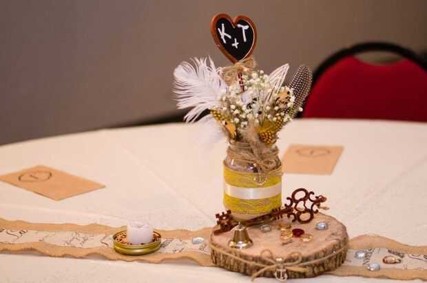 Tarros de Mason: Tomé cinta de arpillera/encaje de cualquier almacén/Departamento de arte. Fuimos con amarillo, ya que es mi color favorito. Entonces envuelto en capas de la cinta y usa una pistola de pegamento caliente para sellarlos. Envuelve las cimas en cordeles de yute o cadenas blanco. Te recomiendo un tema mix & match, especialmente si usted está tratando de ahorrar dinero, porque realmente tienes la oportunidad de utilizar todos los materiales puedes comprar sin tener toneladas de izquierda innecesario overs. Un amigo mío vende joyería en línea, y ella fue capaz de encontrar estas pequeñas anclas que até en el yute de la guita y sellaron los arcos con una gota de pegamento caliente. Encontramos las plumas en línea. Hay toneladas de sitios web con diferentes tipos de plumas. Me gusta plumas de guinea, porque las manchas son un gran contraste con plumas llano. Utilizamos una variedad de guinea, plumas (ya que son muy diferentes de hombre a mujer), plumas de avestruz (cuanto más tiempo mejor ya que ahuecar bien siempre puede cortar la parte de atrás hasta el tamaño necesario), plumas de gallo (con la V en forma de líneas) y plumas de relleno blanco llano. Tenemos 3 lotes de bebé de aliento el día antes de la boda en Publix (que recomiendo encarecidamente, ya que son típicamente 3 a 10 dólares, frente a unos 12 dólares cada uno en una floristería, y parecen idénticos, si no mejor). Organizamos las plumas alrededor de la respiración del bebé, como proporcionó una base agradable que mantiene las plumas en su lugar. El corazón pizarra palos fueron encontrados en la tienda de artesanía de Joann. Creo que eran alrededor de.80 centavo tras el descuento. Mirando hacia atrás, yo sugeriría para usar la tiza en lugar de tiza real, ya que son mucho más fáciles de manipular. En el fondo de los tarros de masón, utilizamos un poquito de arena, para la estabilidad y para anclar mejor el palillo de la tiza y el bebé de respiración.