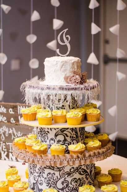 Un buen amigo mío hacer la torta y cupcakes para nosotros. Colocamos una flor de arpillera que encontramos en la tienda de artesanía de Michael en la base de la torta. Una de mis damas de honor nos compró la "J" para el topper del pastel. Ella no dijo que ella encontró, pero ella dice en línea encontró a un buen precio. Nuestros colores fueron amarillo, gris y arpillera. Para que la chica que hace los cupcakes había espolvoreado puntos grises en la parte superior de los cupcakes.