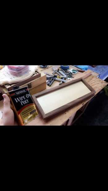 Poner un final en el marco y la parte inferior. Uso wipe on poly porque saca el grano y me encanta la mirada de él. También puede poner acabado en las piezas del puzzle que no mancha; o dejarlas como madera en bruto. (Preferiblemente poner un sellador sobre ellos para evitar que se descolore los años)