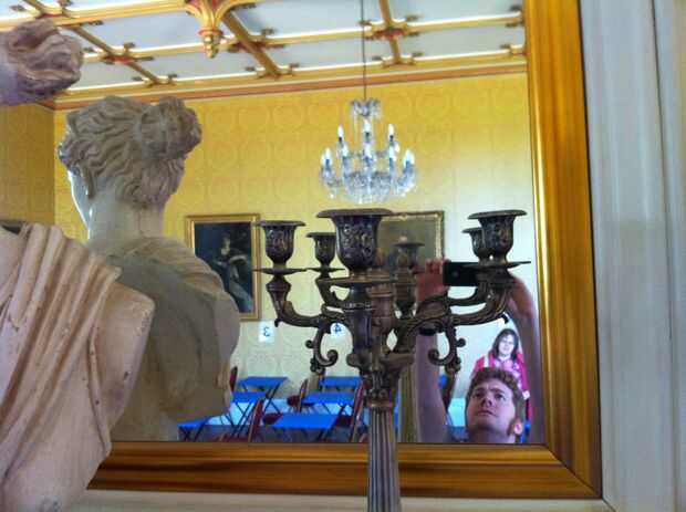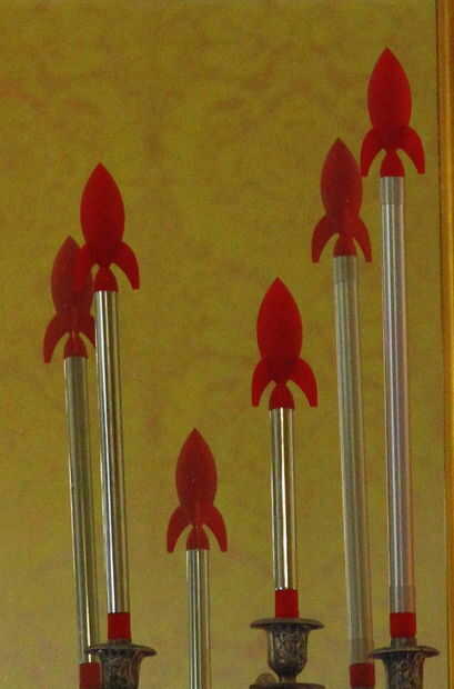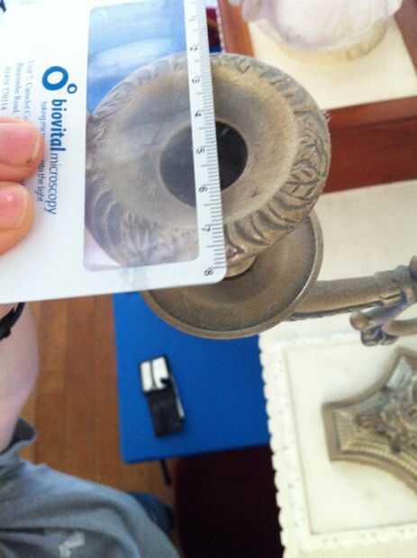 Hemos visto el lugar, había un candelabro vacío en la sala de ceremonia que me dio una idea. Me mide mientras yo estaba allí y diseñó un par de piezas 3D imprimir por triplicado. Una parte era un adaptador recto para enchufar el candelabro para montar una sección de tubo de poste de la cortina de cromo, y la sección era una versión más grande del cohete de titular de la tarjeta del lugar con un trozo para tapar el cohete en el tubo. Con tres tubos de diferentes longitudes y el espejo detrás, esto dio un gran efecto visual.