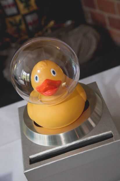 Protegiendo nuestro buzón de tarjeta era espacio pato, un pato de goma gigante con un casco del espacio. Hice el casco por dremelling un hoyo de cuello en un adorno de plástico gigante diseñado para rellenar con dulces. El adorno se abre por la mitad para que el agujero sólo tenía que ser lo suficientemente grande para clip redondo cuello de pato.