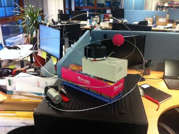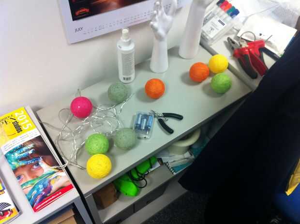 Las bolas son esferas de algodón envuelto de un barato juego de luces LED. Tenían una bola de plástico transparente dentro de la capa de algodón que estaba enganchada en las luces de cadena. Doblar el alambre que les engancha significado fácilmente fueron liberados y dos agujeros pequeños fueron perforados para alimentar al cable. También se amplió el agujero original de LED para ajustar el módulo LED y la batería de un globo del LED Illoom, permitiendo que la bola del planeta brille sin necesidad de cables antiestéticos (en la imagen 7 se pueden ver las lengüetas del tirón a).