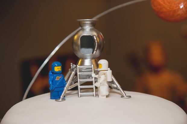 El topper de la torta compuesta por un pequeño lander Lego-escala y dos spacepeople de Lego. Habíamos elegido un blanco y uno azul para combinar con vestido de Katia y mi traje azul respectivamente. Decidí coser un pequeño parche de seda que tenía (a la izquierda encima de hacer caja del anillo de Katya) en un vestido de Novia de Lego-escala para completar el par.