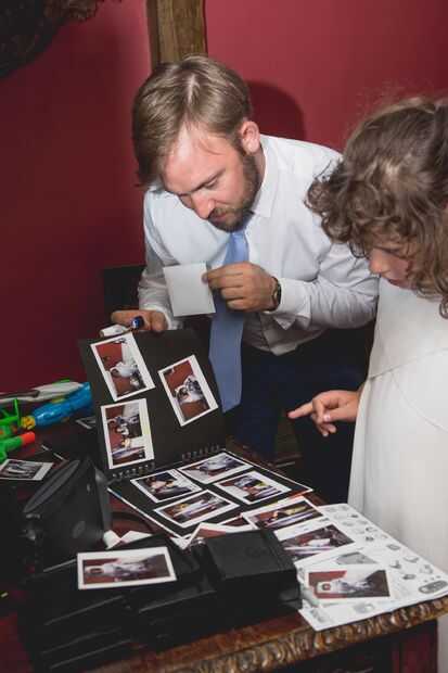 Para agregar un poco de diversión que tenía una estación de fotos polaroid para los huéspedes agregar en un libro de chatarra. El tema de espacio esto hace muy fácil ya que habían muchas cosas disponibles para usar.