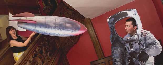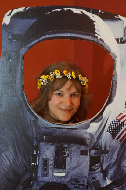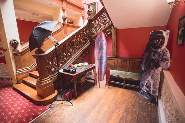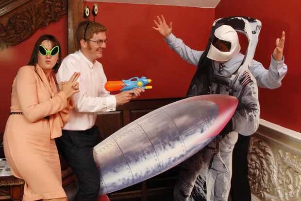 Encuentra un lugar tranquilo en el lugar bajo una escalera y poner cartulina recortes de un cohete y astronauta (cortamos la visera para que personas ver a través). Luego añadió algunos apoyos de tienda libra extranjero al azar y otros pedacitos y dejó una cámara polaroid para permitir la creatividad de las personas asumir.