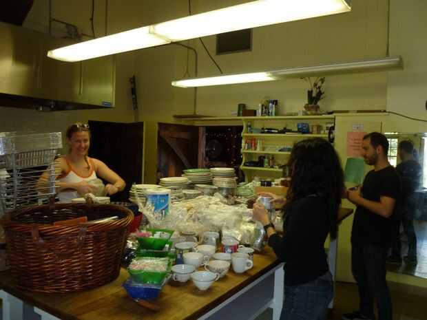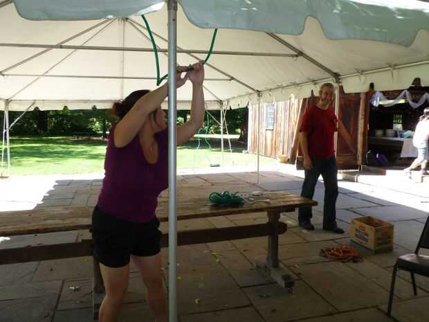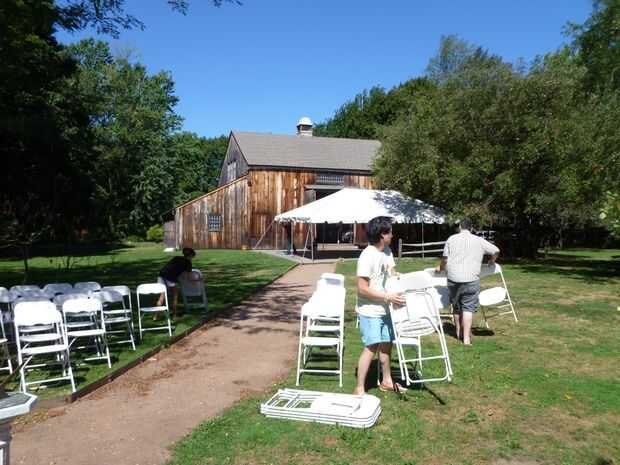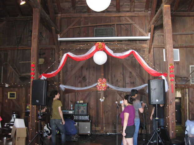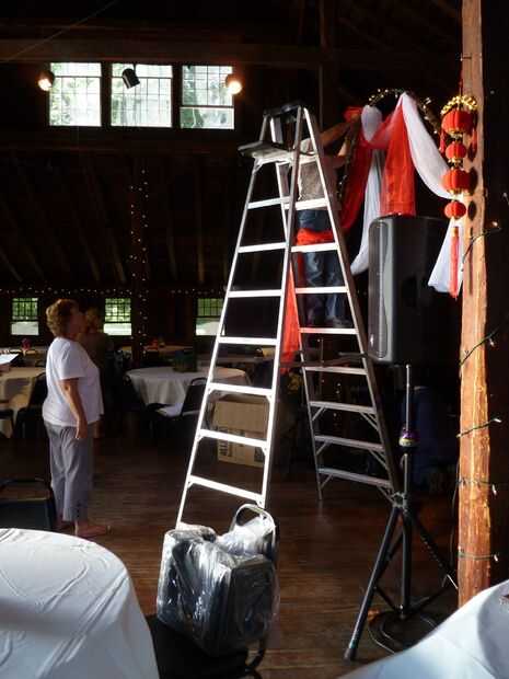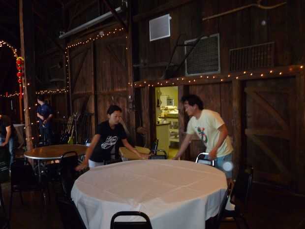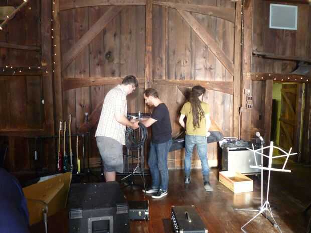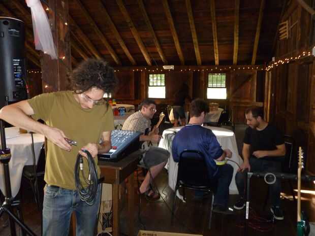 Teníamos sólo dos horas para configurar en el granero de la mañana de la boda, así que tuvimos que hacer tanta preparación como sea posible antes de llegar. Las madres de la novia y novio consolidado mientras que la decoración de la boda acamparon en mesas y sillas, desenvuelva y establecen vajilla, cables, afinar guitarras y configurar el PA para la configuración de la música.
