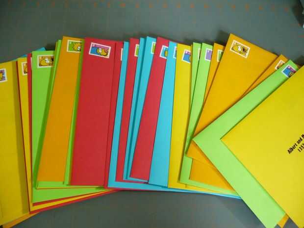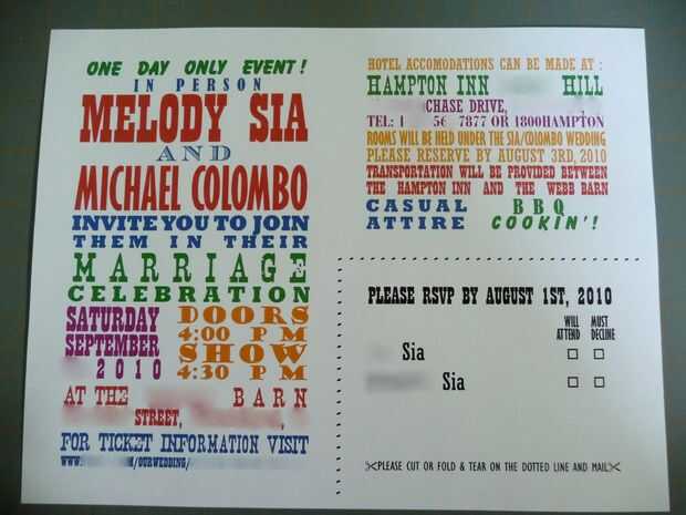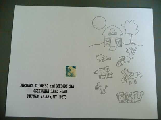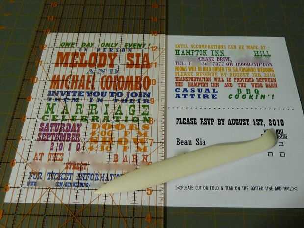 Compramos un paquete de cartón blanco liso y trabajado en Photoshop para las invitaciones. Mike había propuesto durante un viaje a campo través incluye pasar de Nashville, donde nos hemos inspirado en los diseños de La portilla mostrar impresiones . El frente de las invitaciones fueron dibujados por la melodía (que incluye el granero y nuestros tres gatos). Después de la exploración y limpieza en photoshop, se incluyeron un RSVP como postal de recorte. Esto mantiene las invitaciones lo bastante ligeras como para un sello de primera clase regular y sólo tuvimos que utilizar estampillas postales de la convocatoria. Una herramienta deshuesa se utiliza para plegar las invitaciones, luego metida en sobres coloridos de grapas.