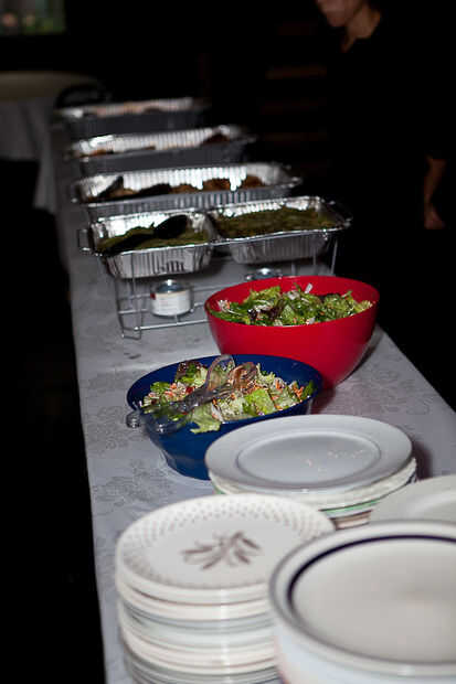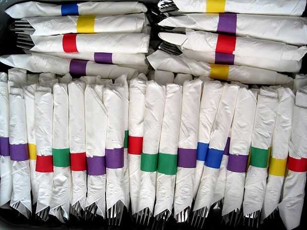Era todo pesado para el transporte en las grandes cajas de madera que Mike hizo de la tarea, pero nada no podían manejar una van de UHaul y una entusiasta de la boda. Hemos sido capaces de pedir prestado a lavavajillas de un amigo antes, y luego el plástico envuelto todo lo posible para mantenerlo todo limpio. Para los cubiertos se utilizan servilletas de papel con anillos de servilleta de papel hecho a mano.