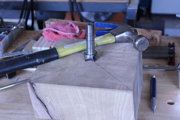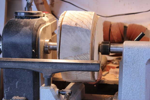 Primero lo había montado en el torno usando un centro de dientes rectos y el centro vivo de la acción de la cola. Uso un martillo colocar el estímulo de la unidad en el centro de la parte inferior de la bodega hasta que los dientes son aproximadamente 1/8" en bloque.