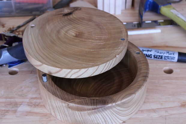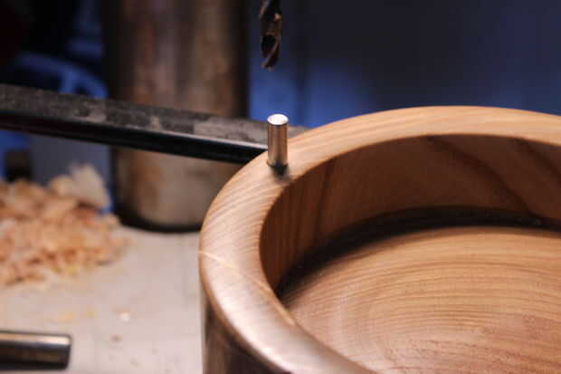 Después de tener su marca en la tapa, utilizando el taladro, perfore a medio camino a través de la tapa en el lugar indicado. luego vuelva a colocar la tapa y ver cómo encaja. el pin no debe dejar de cerrar completamente. Debe ser espacio libre. así que si necesitas hacer el agujero más profundo, no sobre la base de la bodega, en lugar de la tapa.