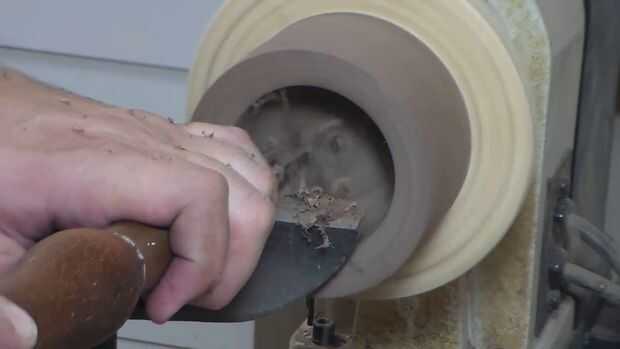 Entonces conectada a una placa de cara con una cantidad generosa de pegamento caliente y ahuecado hacia fuera de la cavidad del centro con un raspador de redondos de la nariz. Esto es trabajo lento y tienes que volver a afilar su rascador 2 - 3 veces durante el vaciamiento, pero te queda una superficie muy limpia y sin orificio piloto del centro de una pieza Forstner.