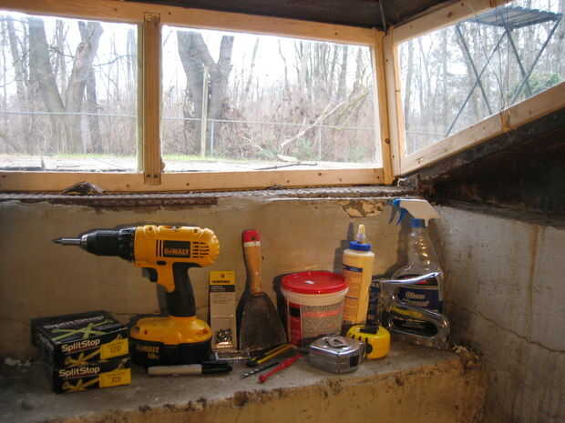 Cuadro 4: Las herramientas, tornillos, pegamento utilizado, además de cristal los restos, un paquete de 8 pies 1 x 2 blanco pino, oh y por supuesto un chopsaw. Los tornillos son "Stop-Split" #1 plaza drive #6 1-5/8 pulgadas cabeza plana tornillos para madera, que son un poco como un tornillo autorroscante y son un poco difíciles de encontrar. Son un poco largo y algunos puntos necesitan ser tierra apagado en el exterior. Tornillos estándar de oro funcionan, pero causan mucha división. Utilizando tornillos permiten pegado ensamble uniones tight, y compensación por cosas como un travesaño frontal arqueado. Esto fue un ajuste muy cercano, incluso el grosor del plástico de la hizo caber un poco más. Prueba de la apertura y cierre con regularidad asegurada nada era loco fuera de línea.