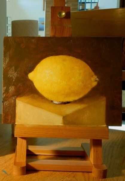 Primero hice un áspero "sketch" de los colores de toda la imagen utilizando y anaranjado (mitad púrpura amarillo medio) y luego agregué un poco más morado (para oscurecer el color anaranjado) y había añadido los oscuros (sombras). Después de eso cuando estaba seca empecé a añadir algunos colores, empecé con el más oscuro, al fondo y entonces trabajado mi manera para arriba. Una vez que fue completado más o menos mi maestro decidió que probablemente hacerlo mirar un poco más la vida como para que él me dio algunos azul para hacer el bloque de aluminio como un bloque de aluminio. También mencioné arriba el limón un poco, agregar más luces de alta y lo que es mirar un poco más rodeados.