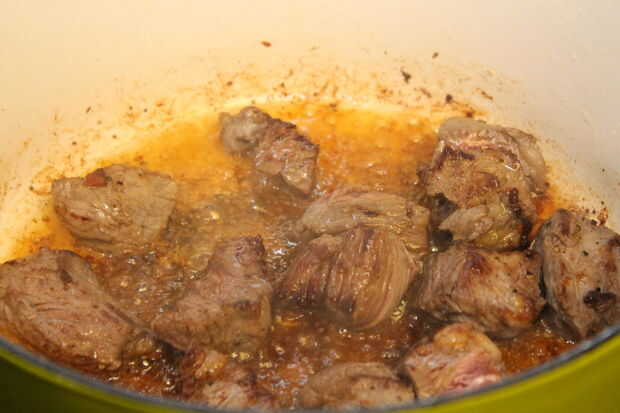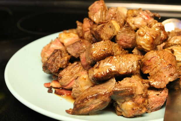 Cocinar uniformemente a cada lado durante aproximadamente 5 minutos de total. Sacar los cubos y poner con tocino en el mismo plato.