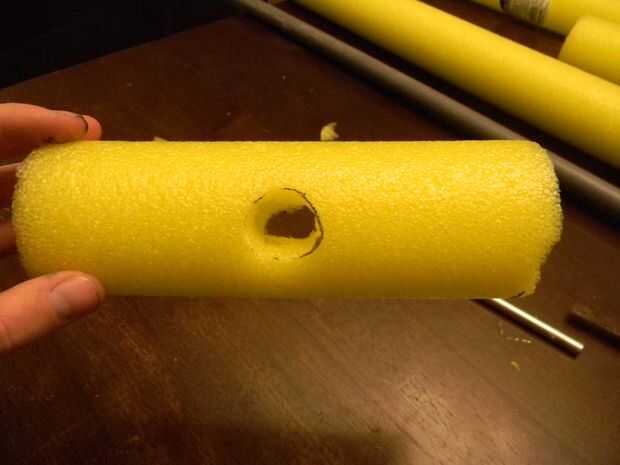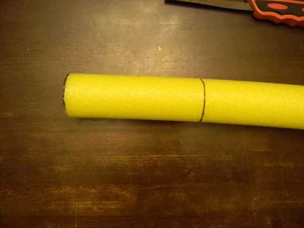 Este paso es para la Guardia cruzada. Cortar un trozo de los tallarines de la piscina por lo menos 6-7 en... Ahora corte un agujero directamente a través de la mitad de la pieza del protector de la Cruz. Ahora deslice esta parte en el extremo del mango de la espada.