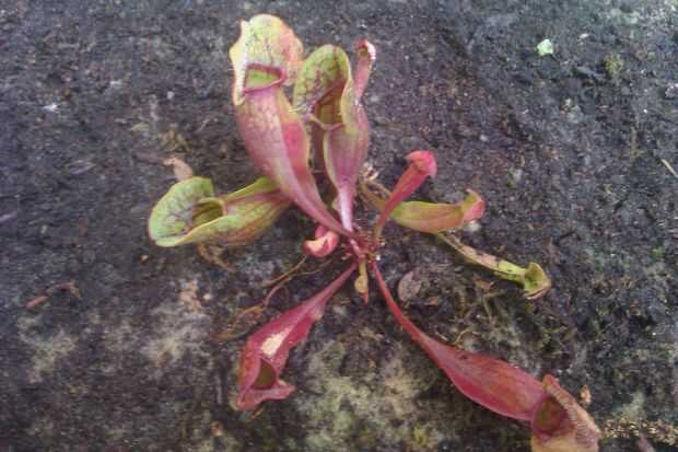Ley púrpura jarras (Sarracenia purpurea-venosa) como mi advertencia por demasiada luz, los lanzadores se quemadura solar en el nuevo crecimiento.