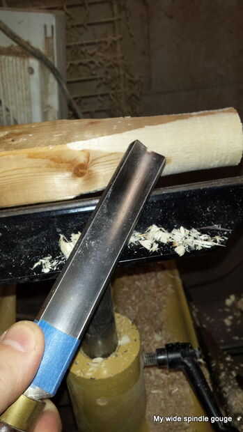 Lo primero que debemos hacer es redondo el huso. Aquí están tres fotos mias haciendo esto. Estoy usando una gubia de eje ancho a cortar la madera, pero se puede utilizar un husillo de desbaste gubia o un cincel para sesgar (más difícil, pero producirá el mejor resultado). Prefiero la gubia de eje ancho porque puedo hacer el 80% de los cortes con ella para hacer este ornamento.