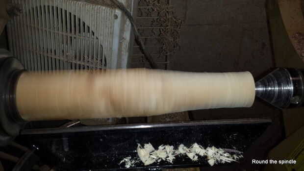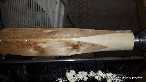 Para iniciar el proceso de que eliminar (corta) las esquinas de la madera en el extremo del cabezal móvil. Con esto se iniciará completar el espacio en blanco en un cilindro. Una vez que ha cortado una vez a la acción de la cola, retroceder una pulgada o tan y quitar algunos fresco cortar madera sin cortar hacia el contrapunto. Seguirá haciendo este espacio en blanco es redondo. Ver fotos de arriba