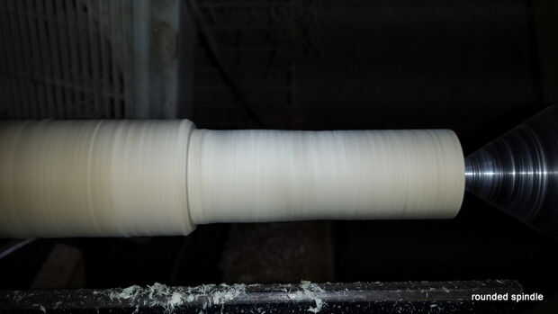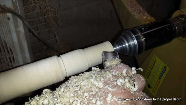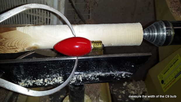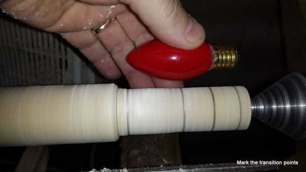 El proceso ahora continúa reduciendo el cilindro de madera hasta que quede del mismo diámetro que la parte más ancha del bulbo C9. Que corte el eje usando una gubia de huso a las profundidades del corte con el escoplo (ver la 3 º foto). Una vez que el eje es del mismo grosor que la bombilla de C9 marqué las líneas de transición en él en los puntos donde la bombilla cambia de forma: