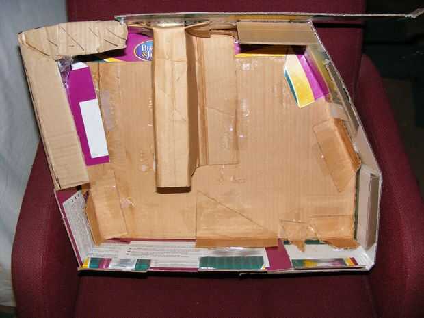 En el centro de la parte superior, he hecho un soporte como pieza de cartón. Endurece hasta la parte superior cuando usted aprieta y ya que es el ancho de la consola de lado, mantendrá a los lados de derrumbarse cuando todo pegado para arriba.