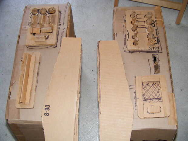 Burlarse de sus tableros de instrumentos. Están varados en Rigel VII, tuve que usar cartulina. Papel maché formarán el perillas, botones, interruptores y bombillas. Usted puede cortar longitudes de clavijas uso magia masilla o cualquier otra cosa para bloquear las formas de los paneles de instrumentos.