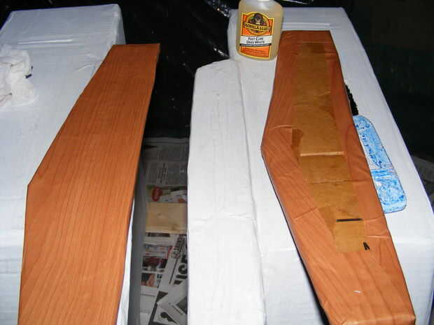 Dejar un poco de cartón desnudo expuesto en la parte posterior así que usted puede pegar a los soportes de los reposabrazos en la consola de lado. Usé algunos pegamento de poliuretano-tipo de relleno para pegar juntos. Una goma y una pintura pueden pesar y fijarlo con la abrazadera en posición mientras se seca.
