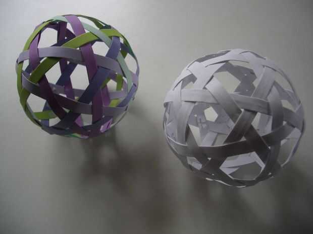El proceso de tejido es un poco complicado, por lo que sugiero que comenzar haciendo una bola de papel para que se acostumbre a la técnica. Una hoja A4 (297 x 210 mm) hará una bola que es de 85 mm de diámetro, porque cada tira larga de 297 mm va justo alrededor de la circunferencia. Por lo tanto, lo que permite 7 mm para el solapamiento donde se encuentran los extremos, d = 290/π o 92 mm. (Será un poco menor porque algunos de la longitud de la tira se toma en tejer adentro y hacia fuera.)