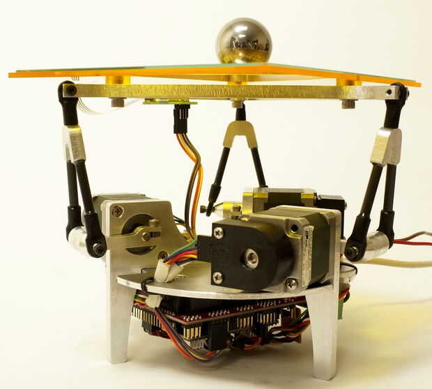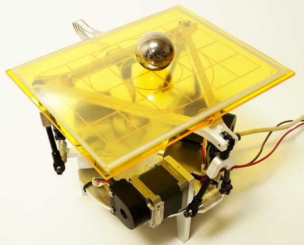 La salida del sistema de control entero es la posición de la bola en la placa. La posición se controla mediante el ajuste de aceleración de la bola. Aceleración de la bola es una función del ángulo de la placa y ángulo de la placa es una función del ángulo de motor paso a paso. Usando la aproximación pequeña del ángulo, un pequeño cambio en motor ángulo de equilibrio debe dar lugar a un cambio linealmente relacionados con ángulo de placa y por lo tanto cambio en la aceleración de la bola. Esta aproximación rudimentaria funciona bastante bien para el control de la bola incluso en ángulos más grandes.