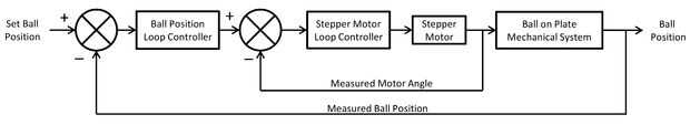 Una buena aproximación para controlar el movimiento de la bola es disociar la x y y direcciones en la placa. Esto permite dos lazos de control independientes por separado. Un bucle controla la ubicación de x de la bola y otro controla la ubicación de y. Cada lazo de control para el x y y eje consta de dos partes; un lazo de control interno y un bucle externo. El lazo interno es responsable de los motores paso a paso en lazo cerrado para control del ángulo. Motor ángulo se obtiene de codificadores de la cuadratura en cada motor paso a paso. Un ángulo del sistema para los motores paso a paso se proporciona desde el bucle externo y la diferencia entre el ángulo del sistema y el ángulo medido impulsa la velocidad de angular motor paso a paso.