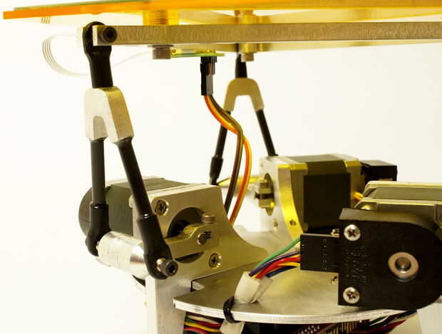 La plataforma está diseñada para tener tres grados de libertad. Los motores paso a paso se configuran en un patrón de triángulo equilátero. Esta parejas de configuración x e y de movimiento pero completamente los resultados en un diseño mecánico más sencillo para limitar la posición de las plataformas. El diseño también permite que la plataforma pivotar alrededor de la ubicación de la bola en lugar de sólo el centro. Este enfoque debe permitir para cambios más bruscos de aceleración de la bola, como la bola va a través sin desplazamiento vertical durante ajustes de ángulo de la placa. Actualmente la plataforma sólo es programada para girar sobre el centro.