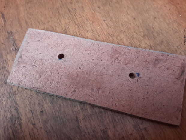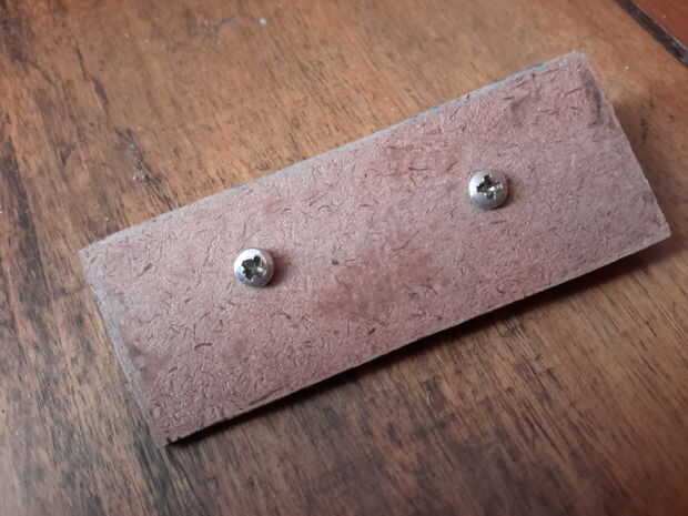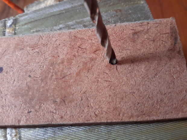Dos agujeros perforados en un pedazo pequeño de madera, suficiente para dos tornillos de sujetar la lámpara.