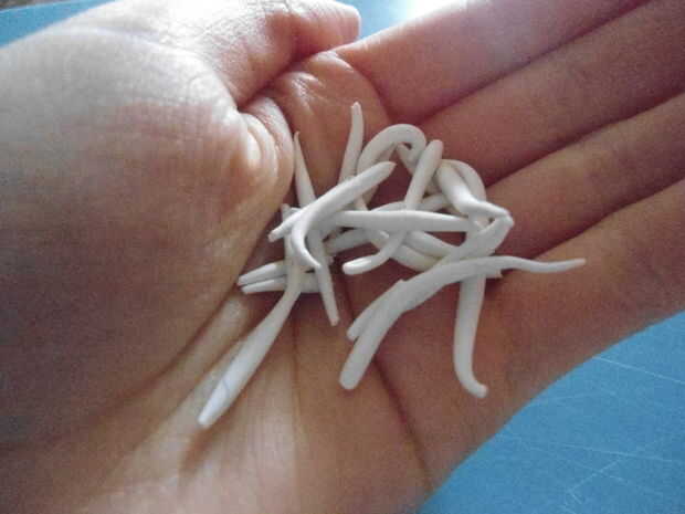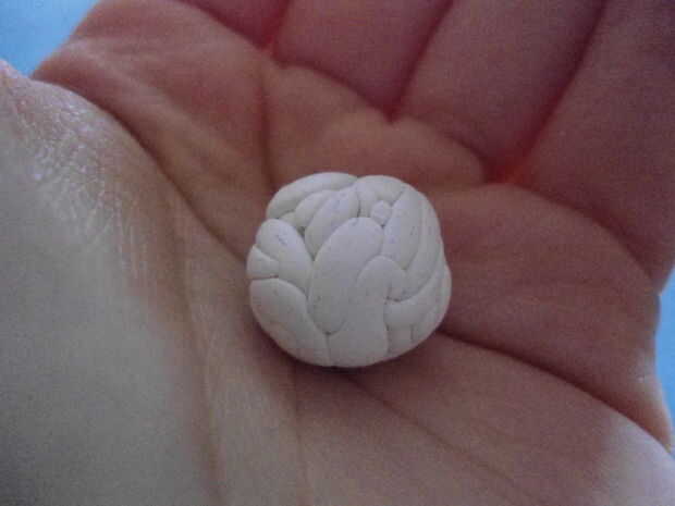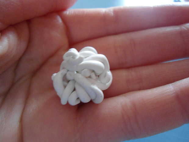 Tomar las piezas de arcilla en la mano y rodar en un movimiento circular. Mantener rodar en la mano hasta que parece que la tercera imagen. Asegúrese de no rodar demasiado o no podrás ver las líneas. Si tira demasiado, está bien, sólo repetir el paso 2. Una vez que su bola, inserte el perno de ojo por la parte superior.